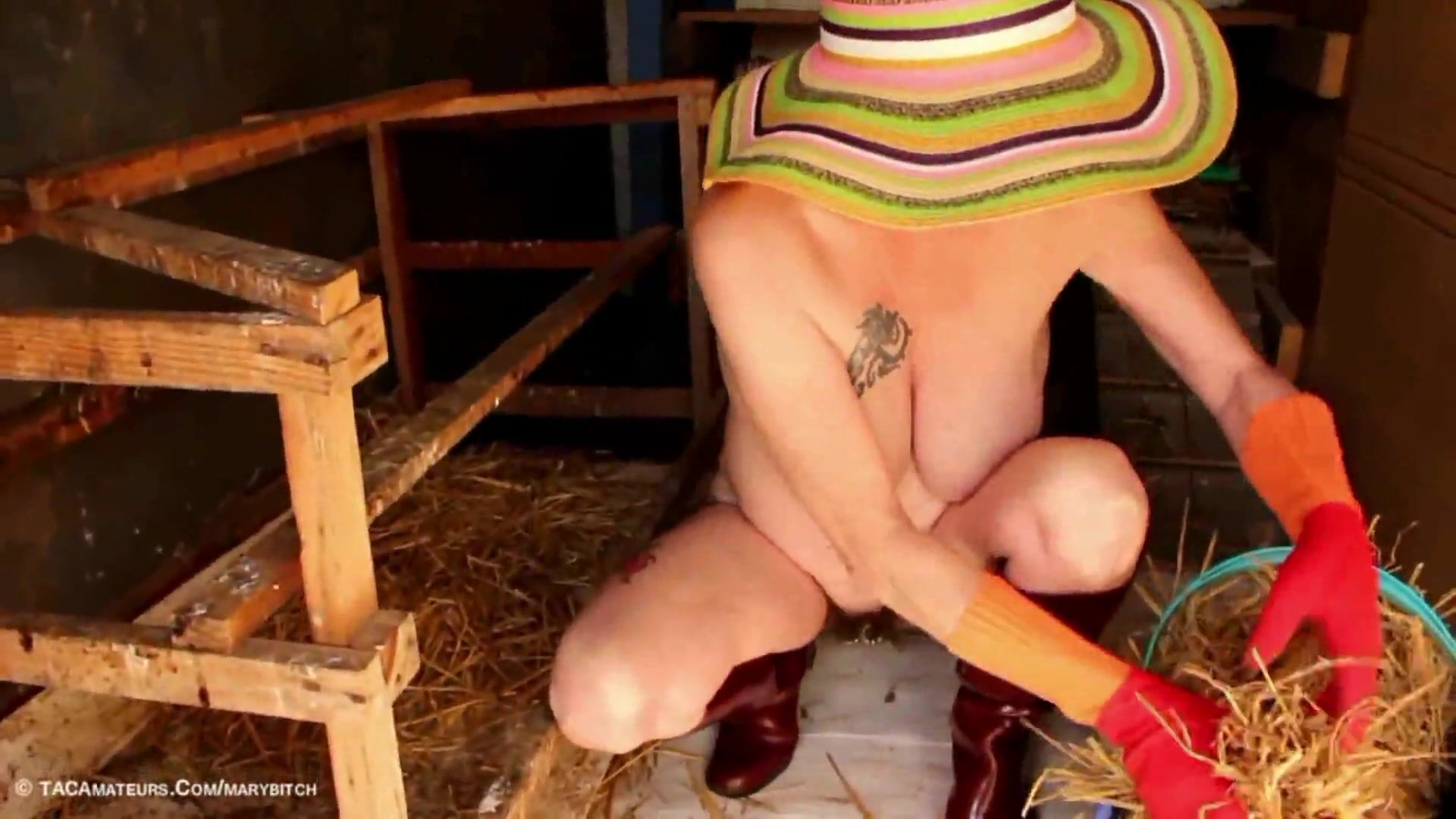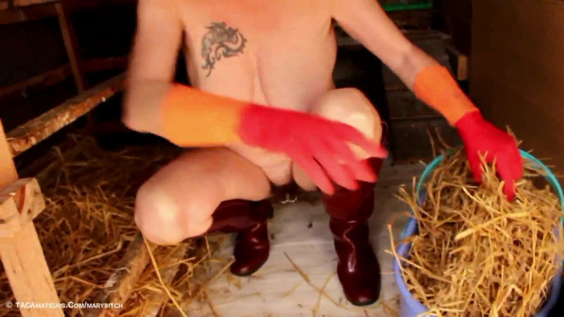 Second part and end my special video for rubber boot fetishists or I continue to clean my hen house, naked with may rubber boots and gloves and then I go to the garden to empty straw waste on the manure pile, which is very good for my kitchen garden.