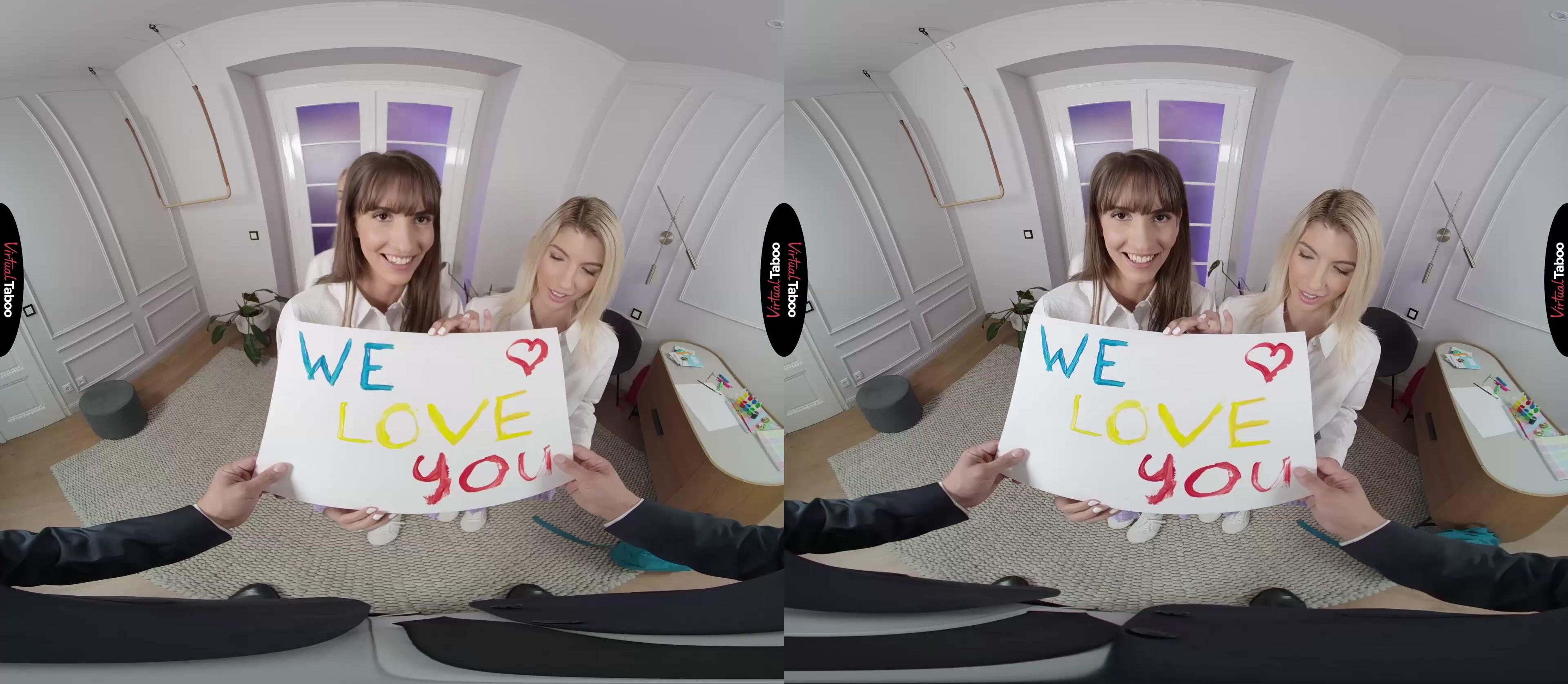 After fucking their handsome professor, Missy Luv, Barbie Brill and Lili Charmelle decide that they have to show their love to their teacher. They know exactly what to do to get the professor’s attention. In this VR porn video, they paint a sign to make their feelings clear and then pick out sexy matching schoolgirl uniforms before paying him a surprise visit. You are nervous when all three of them show up at your door, but their clothes and demeanour give you the idea that they are here for fun. If their “We Love You” sign wasn’t quite enough, their collective tit flash certainly does the trick. Their panties come off as your cock comes out and the two sexy blondes are eager to introduce their friend to his throbbing meat pole. They pass it back and forth, each one trying to suck you better than the last. Lili gets to fuck you, but keeps her mouth busy thanking and satisfying her horny classmates. Knowing it could cost you your job, you are sure to get as much pleasure out of this impromptu private VR porn tutoring session as possible. You fuck each tight pussy with long deep strokes, enjoying your second time with young ladies. Though they are fine sharing your dick, all three girls are greedy when it comes to your load. They all want to be the one to make you shoot, but you are smart enough to spray your cream across all three pretty favourites. It wouldn’t be proper for you to show favouritism after all.