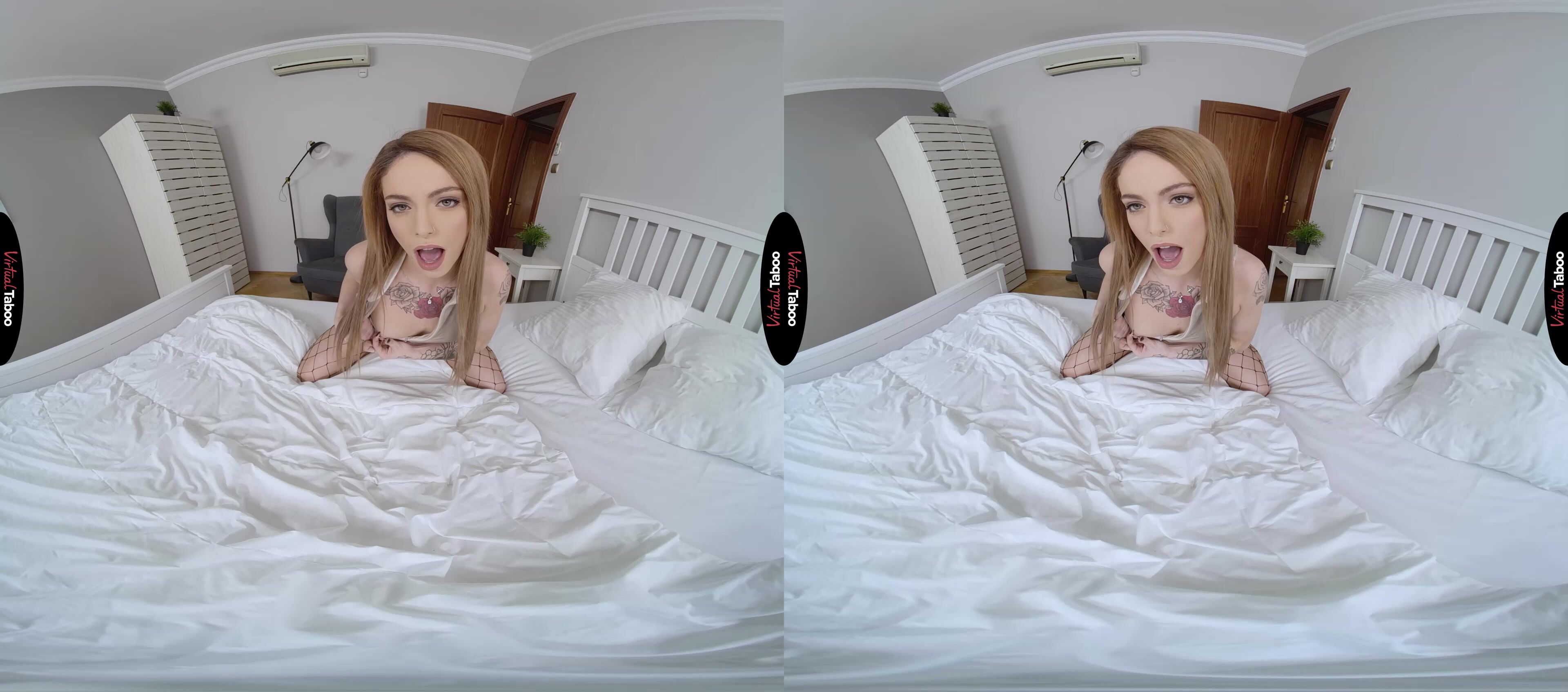 Pretty coed Clara Mia has never had any trouble finding guys to date. She is good looking and has a reputation at her college for loving sex. Still, she is feeling a little bored and a lot horny just hanging out at home. She could easily call up one of her regular fuckboys or hit a VR porn dating app for a quick hookup, but today she has something different in mind. Today she wants to get some dick without leaving the house. Slipping into a pair of fishnet stockings she marches into her stepbrother’s room. As she expected, he has his VR headset on, probably watching taboo porn. You try to hide what you are doing, but she flops down on your bed and wiggles her exposed ass. She tells you that she knows you masturbate in here thinking about her and if you will just admit it, she is willing to let you do it with her right in the same room. Before you can even think, she spreads her legs and sticks her feet in your face. You aren't about to say no to such a fantastic opportunity and pull your hard dick out of your pants. Impressed by what she sees, Clara instructs you to pump while she plays with herself. She is as pretty as any of the girls you get off to with your VR headset and she can see the desire in every throb of your cock. Sliding her fingers inside she starts to moan along with you, begging to see you shoot your load. It is every bit as hot as she hoped and her fingers push her over the edge. You loved the show, but ask if you can fuck next time.