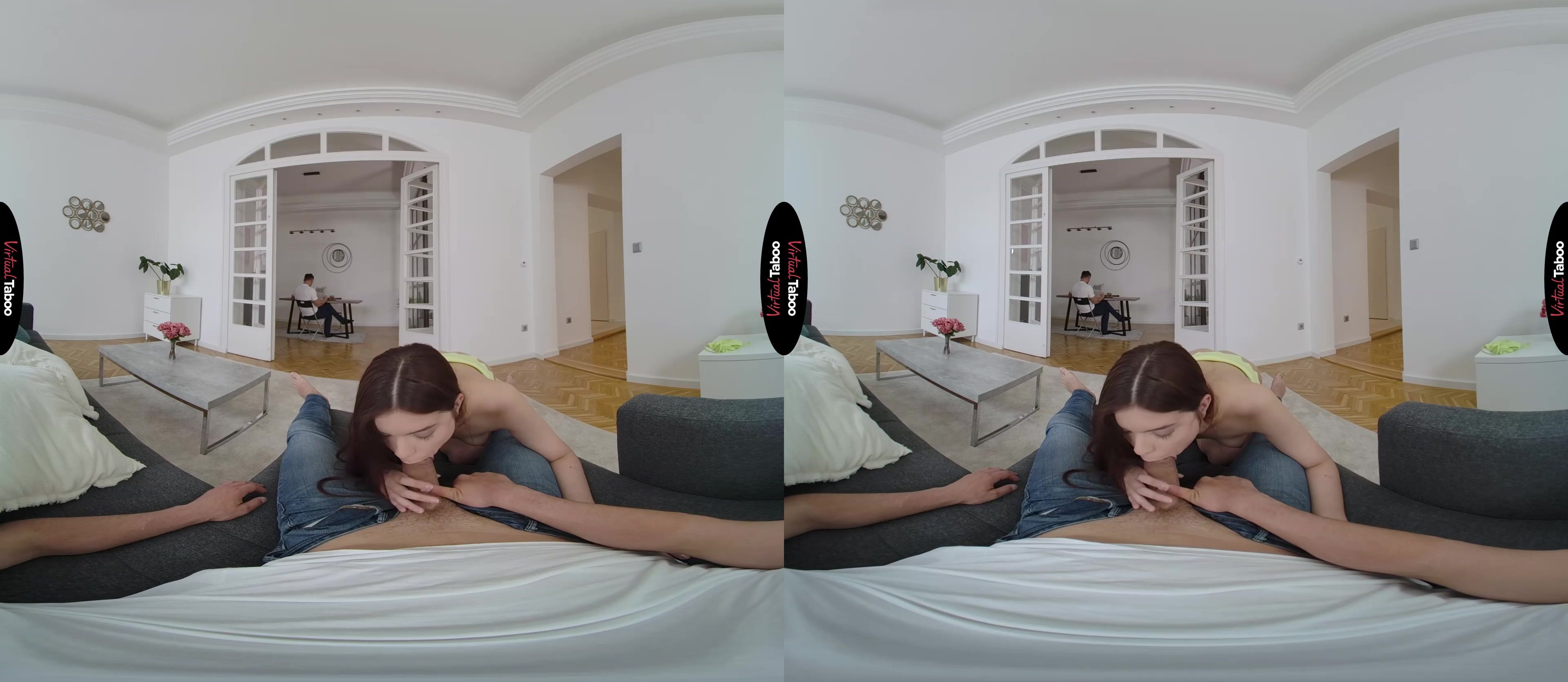 Emily Mayers is all alone with her stepfather and stepbrother for the weekend. Her mom is off on a business trip and the pretty teen has special plans. She has seen the way her stepfather looks at her and has caught her stepbrother jerking off to sister themed VR porn more than once. While serving her stepfather breakfast, Emily sees you checking her out and starts to tease you by revealing that she isn’t wearing any panties. You are shocked by the brazen display but does not turn away as she moves in closer and gives you a perfect view of her tight young twat. She watches your bulge grow in your jeans and knows that she has you. Even with father just feet away, you can’t resist when she takes your cock out and puts it into her mouth. Thinking you might just cum quickly in her mouth, you are shocked when she strips and mounts your dick. In this VR porn scene, you have to stay quiet with father so close, but you can’t stop once you feel that silky smooth slit on your stiff sword. She takes every inch from behind, knowing you have dreamed of this a million times and loving how hard she makes your meat. As she feels your body shaking and your climax approaching, Emily moves to her knees and sucks as hard as she can. Staying as quiet as you can, your load explodes all over her pretty face. Just at that moment, her stepfather turns around and catches you. Emily runs away embarrassed, but she knows who is next and she can’t wait.