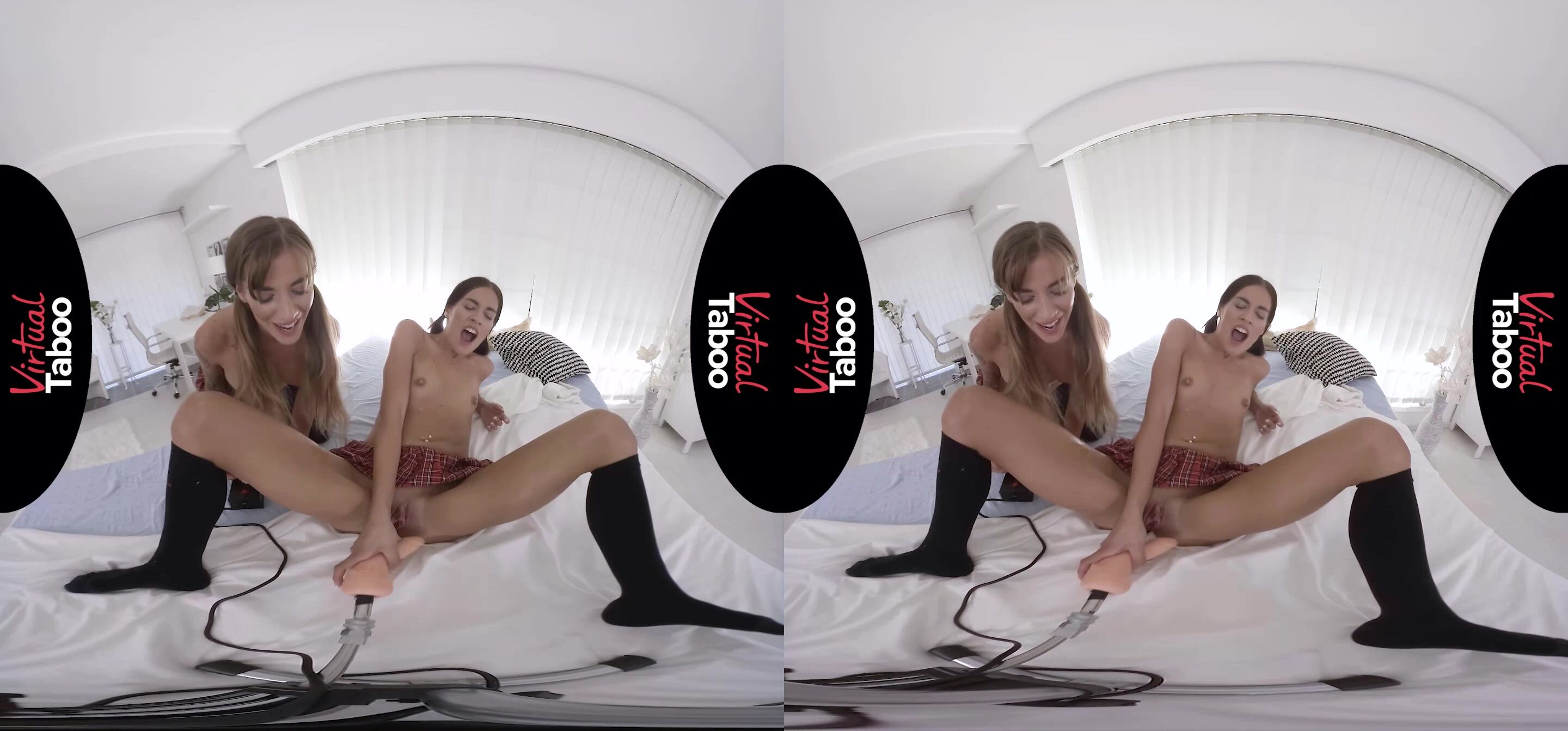 After a long day at school, lovely Dellai twins Evelin and Silvia entered their mother's room only to discover a huge fucking machine on the bed. Having never encountered this kind of a machine before, these two hot teens decided to start fooling around with it. Pressing the button that made the machine start, the girls immediately realized what it was all about and started taking turns sucking on the machine dildo for a bit before taking off their clothes to unveil their slim bodies and tiny tits. The first one to try it out was Silvia. She pulled up her skirt, slid her panties to the side and positioned her pussy directly in front of the fucking machine while her twin sister took control of the speed and the intensity of dildoing. Naturally, right after her, desirable Evelin wanted to give it a go too, so she spread her long legs and let the machine toy penetrate the depths of her orgasmic pink slit while she moaned like a proper porn star. Then, this lusty hottie turned her ass towards the fucking machine and got her beaver drilled in that way as well, before her sis did the exact same thing. Of course, the girls simply could not keep it in them anymore since the mechanical apparatus could not be controlled in a more natural manner, and, so, before they even knew it, strong orgasms hit their delicious young bodies and their screams of pleasure filled the entire house. Mom?s secret turned out to be quite a joyride for her little kinky girls.