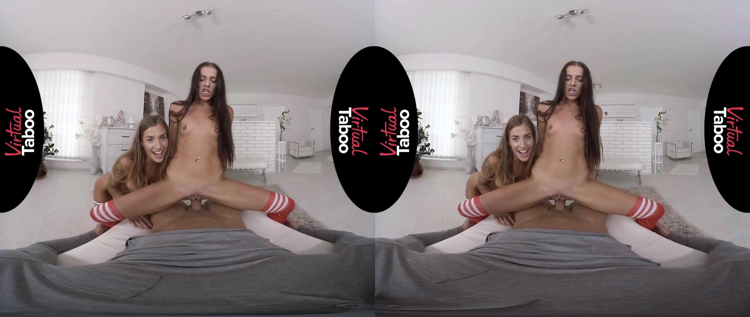 Raven-haired stunner Evelin decided to bring her new boyfriend home and have him sit in the lounge while she used her mouth, her hands, and her ass in order to get his cock rock hard before biting it through his pants and leaving the room only to reappear after a few moments. When she came back, this slim filly immediately whipped out his huge boner and started sucking on it like a pro. But, the guy figured out that something was amiss, and as soon as she whipped out her tits, he realized that her hair was different and that she had tattoos all of a sudden. Even though she looked like Evelin, this sexy girl was totally different from her and he told her to stop immediately. At that very moment, his foxy girlfriend came into the room and told him that this was actually her twin sister Silvia and that they have decided to mess around with him for a bit. But, knowing that it is too late, the girls gathered around his stiff shaft and took turns sucking it. Then, they took off each other's onesies and Evelin slid her boyfriend's big boner deep inside of her tight pussy for a ride before letting her twin sis Silvia do the same but in a reverse cowgirl position. Then, both twins Silvia and Evelin got their snatches plowed in the missionary pose before riding this fellow's rod again. Finally, when he knew he could not keep it in him anymore, this dude unleashed his load all over the twin sisters' pretty faces.
