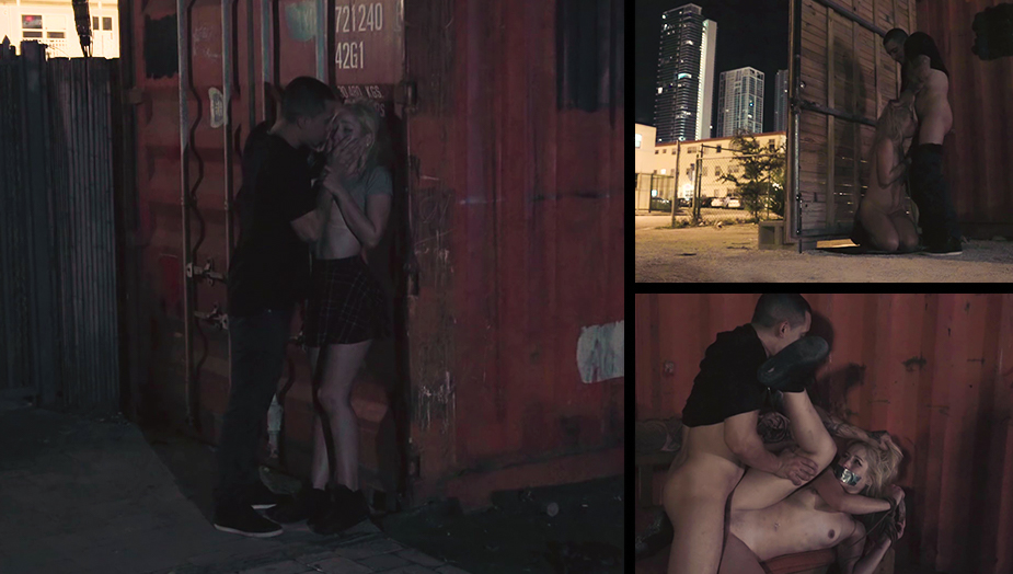 Poor Goldie. Always in the wrong place at the wrong time. This time, we find our favorite sex slave looking hotter than ever and wandering around the dark streets of a bad neighborhood, lost and crying. It just so happens, Bruno is hanging out in a nearby alley. Goldie begs him for help, but Bruno repeatedly tells the desperate slut that he can?t help her, and that he is NOT a nice guy. Goldie persists, and soon finds out that Bruno wasn?t lying as he drags her into an alley by her hair and ties her with rope to a cargo container. He rips her clothes off and savagely gropes her naked tits and pussy. Goldie sobs as Bruno fucks her sweet, little hairless pussy with his big, mean tattooed fingers. Next, he pulls out his fat hard cock and slaps her face before roughly deepthroat fucking her mouth and spanking her welted ass. The duct tape comes out and Bruno tapes Goldie?s ankles together and her mouth shut for the shocking final assault. Goldie?s public sex humiliation has just begun!