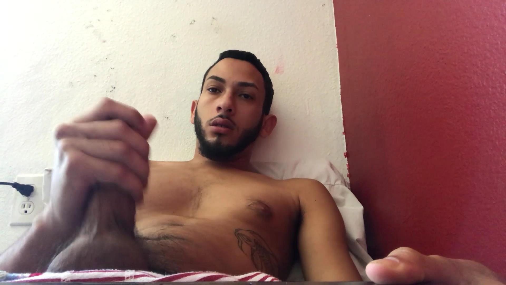 Brain works up a boner and then pushes down his shorts just enough to free his big dick and balls. His balls are literally rubbing up against the lap top he's using to record this jerk off session. He strokes diligently, until his eyes roll back and a load spurts fourth. The last thing we see is the cum dripping off his cock stroking fingers.