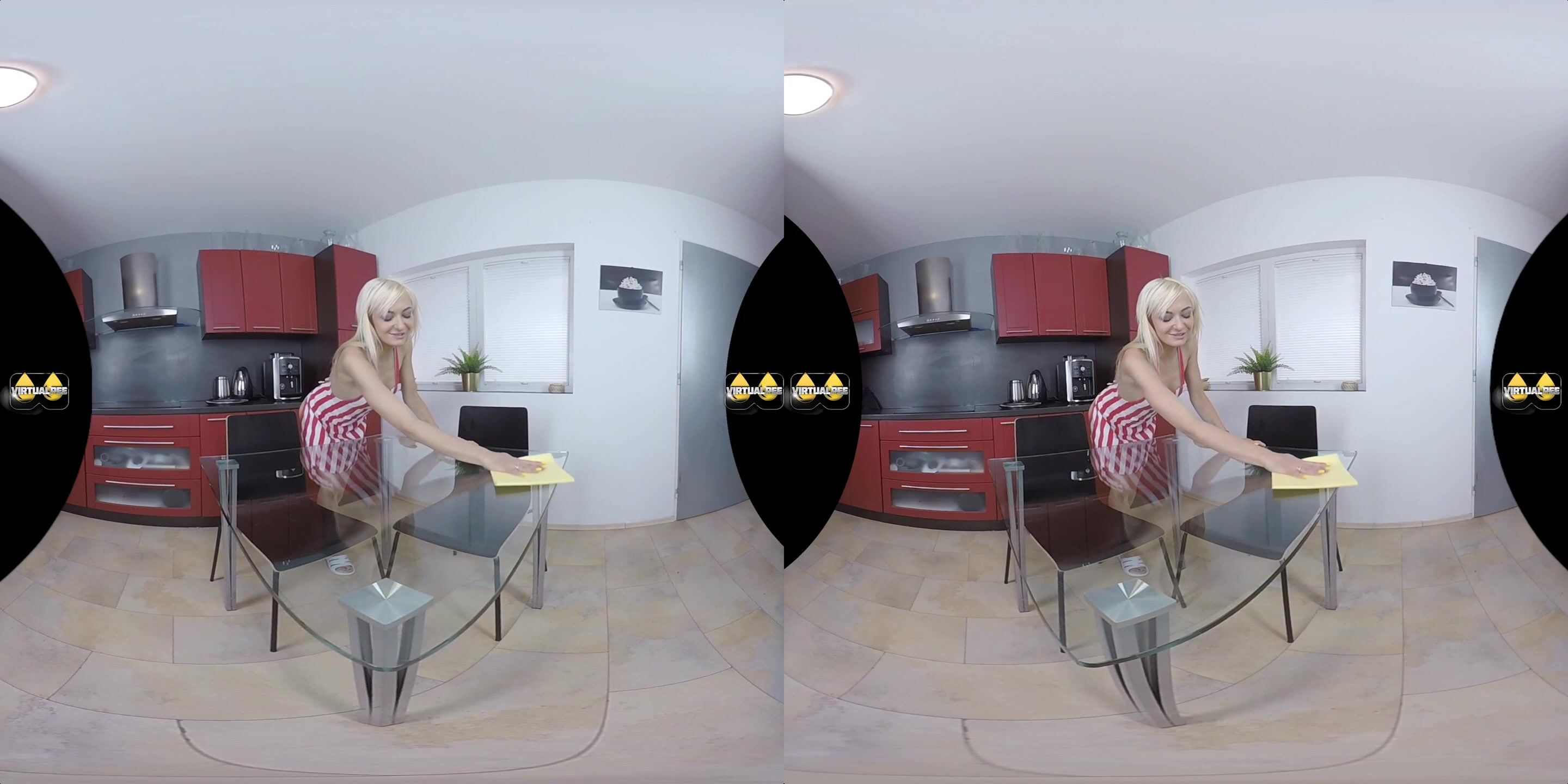 Russian blonde Lola Shine takes cleaning to the next level as she fingers herself and pees all over the kitchen table after stripping naked to bring some fun to her daily routine in virtual reality