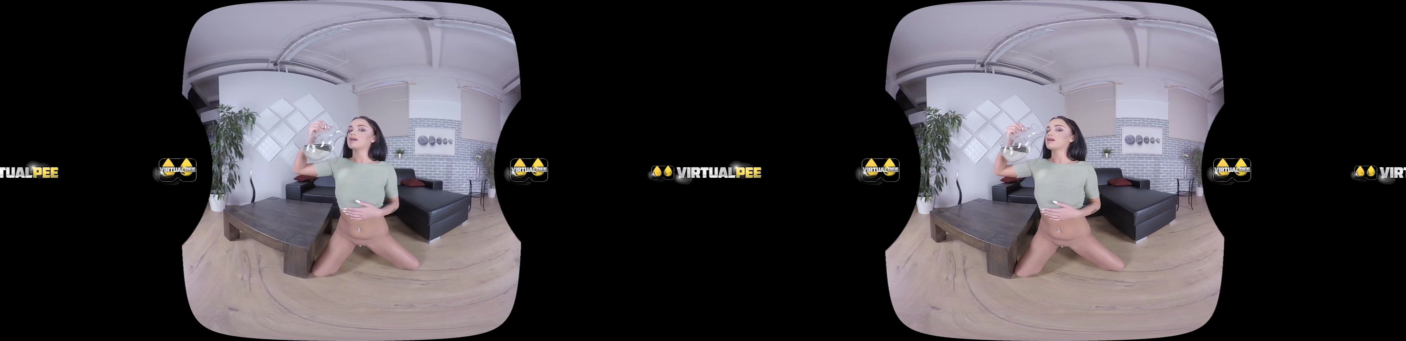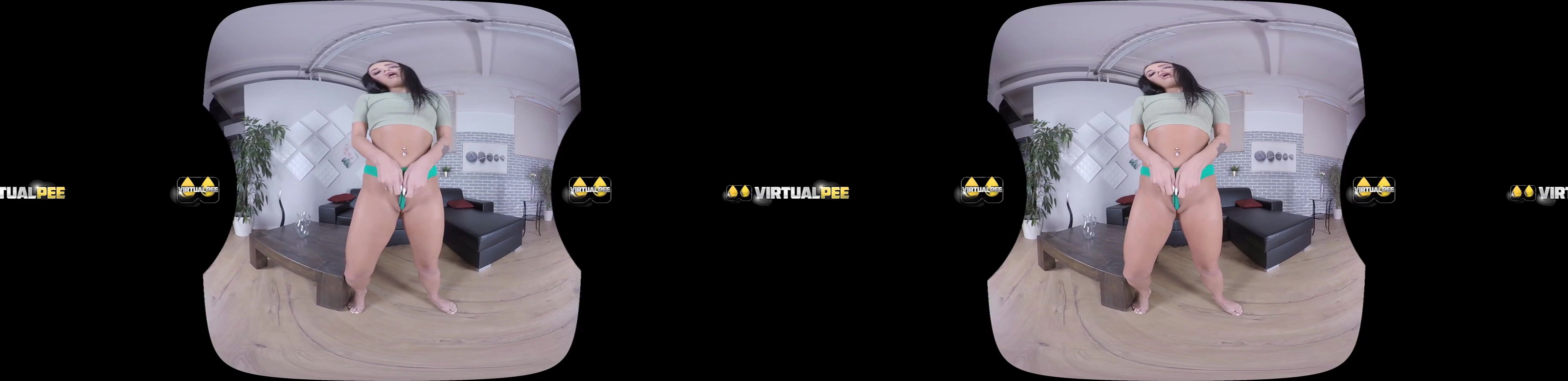 VR porn with dark haired babe Dafne who teases in tiny green panties before pouring her captured golden piss over her cropped top and once naked, fingers her freshly shaved and pierced pussy