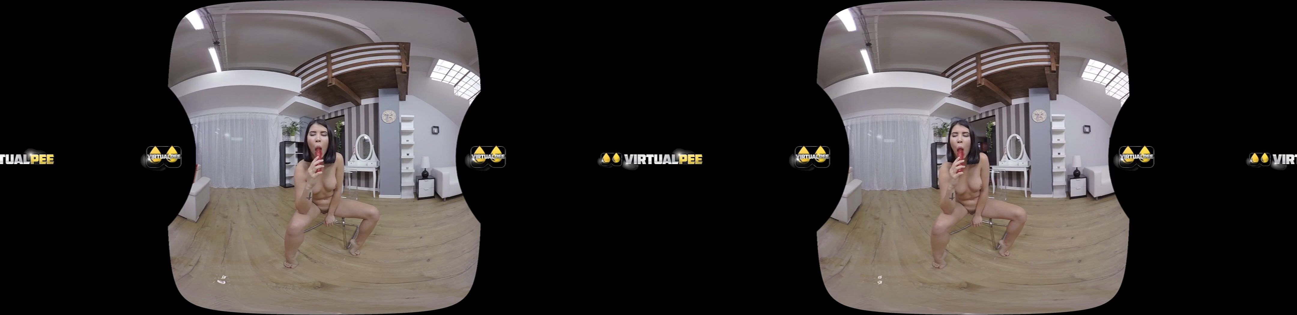 Today's dose of virtual reality porn features exotic looking babe Lady Dee. she starts this scene already naked and sucking on a red jelly dildo, teasing the tip and working the shaft with her mouth. She sits down on a glass chair and starts to toy herself with her little sex toy, taking time to masturbate with her hands. She holds the dildo near her pussy and start to piss on it, tasting her juices as she alternates between sucking and pussy penetration! Suddenly a big messy stream of piss is fired over the floor and Lady Dee is even more turned on while filming her vr porn videos. She certainly looks like she has enjoyed filming for VirtualPee, especially when she orgasms, shuddering while sitting in the chair closely followed by yet another wet stream of her golden pee!