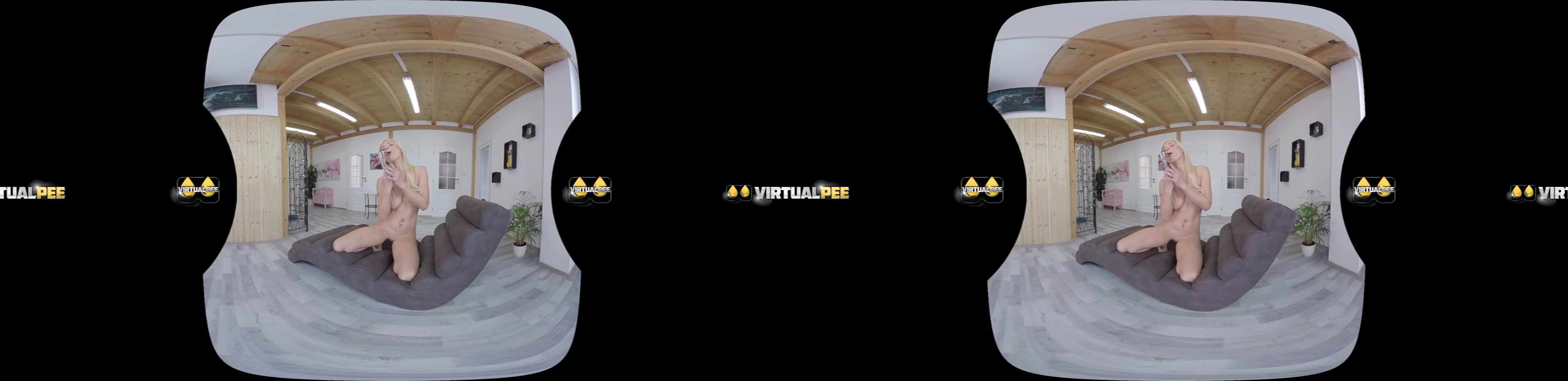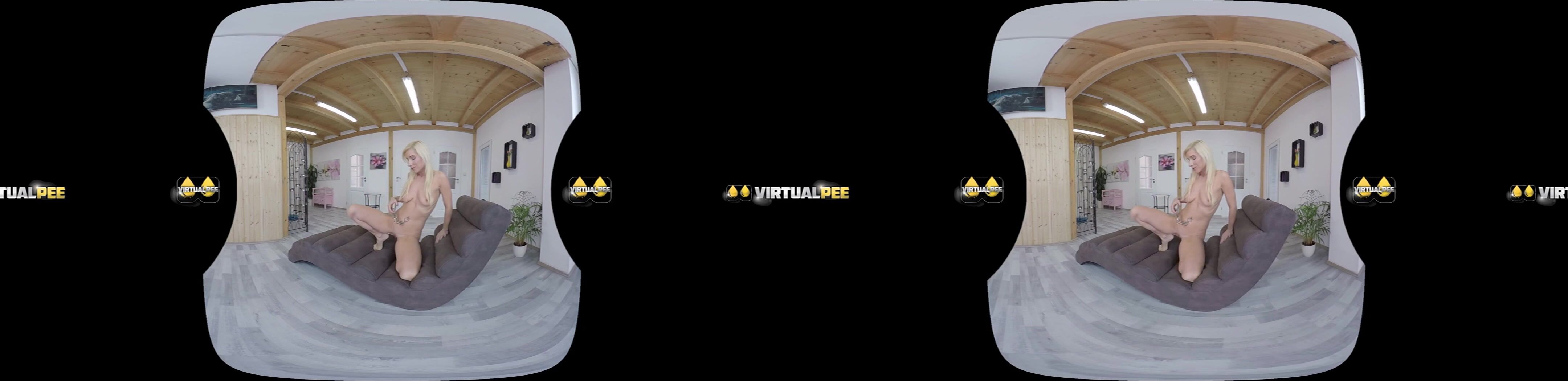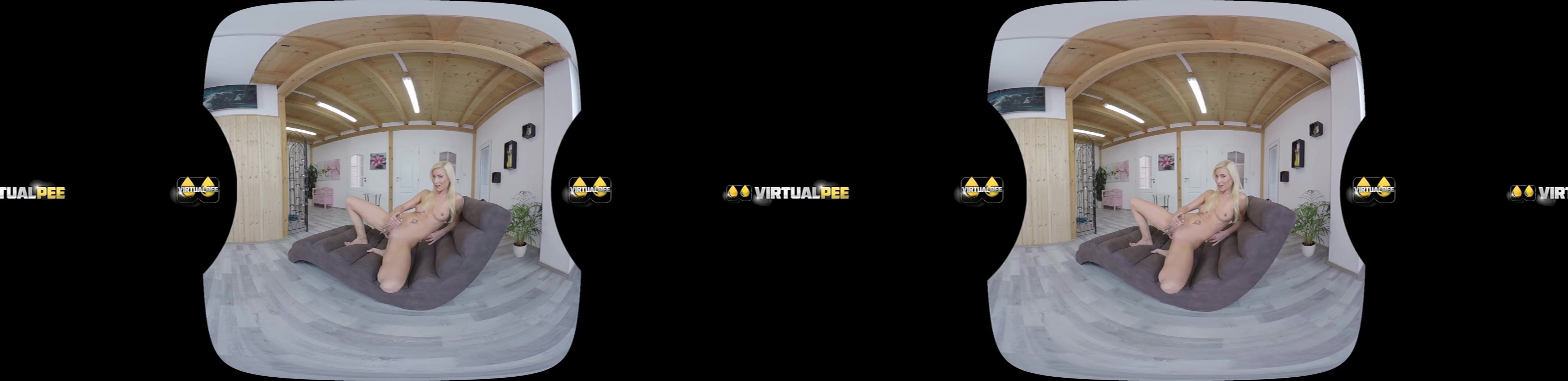 We couldn't wait for hot blonde Vanessa Hell to make her appearance on VirtualPee and in today's virtual porno she is on the chaise longue with a metal speculum. She wastes no time and starts to rub her labia with her little toy before she starts to finger herself. Soon after, Vanessa inserts her speculum into her stunning pussy and uses it to fuck herself fast. She gapes her pussy apart and then decides to lay back with her legs in the air, firing a stream of her golden piss over herself and the chair beneath her. She gets completely drenched in her own pee and tries to catch it in her mouth too! Vanessa is so turned on by her piss play that she bends over and plays with the damp patch of pee she has left behind. Vanessa Hell is one of our favourite pissing pornstars (if we are allowed a few!)