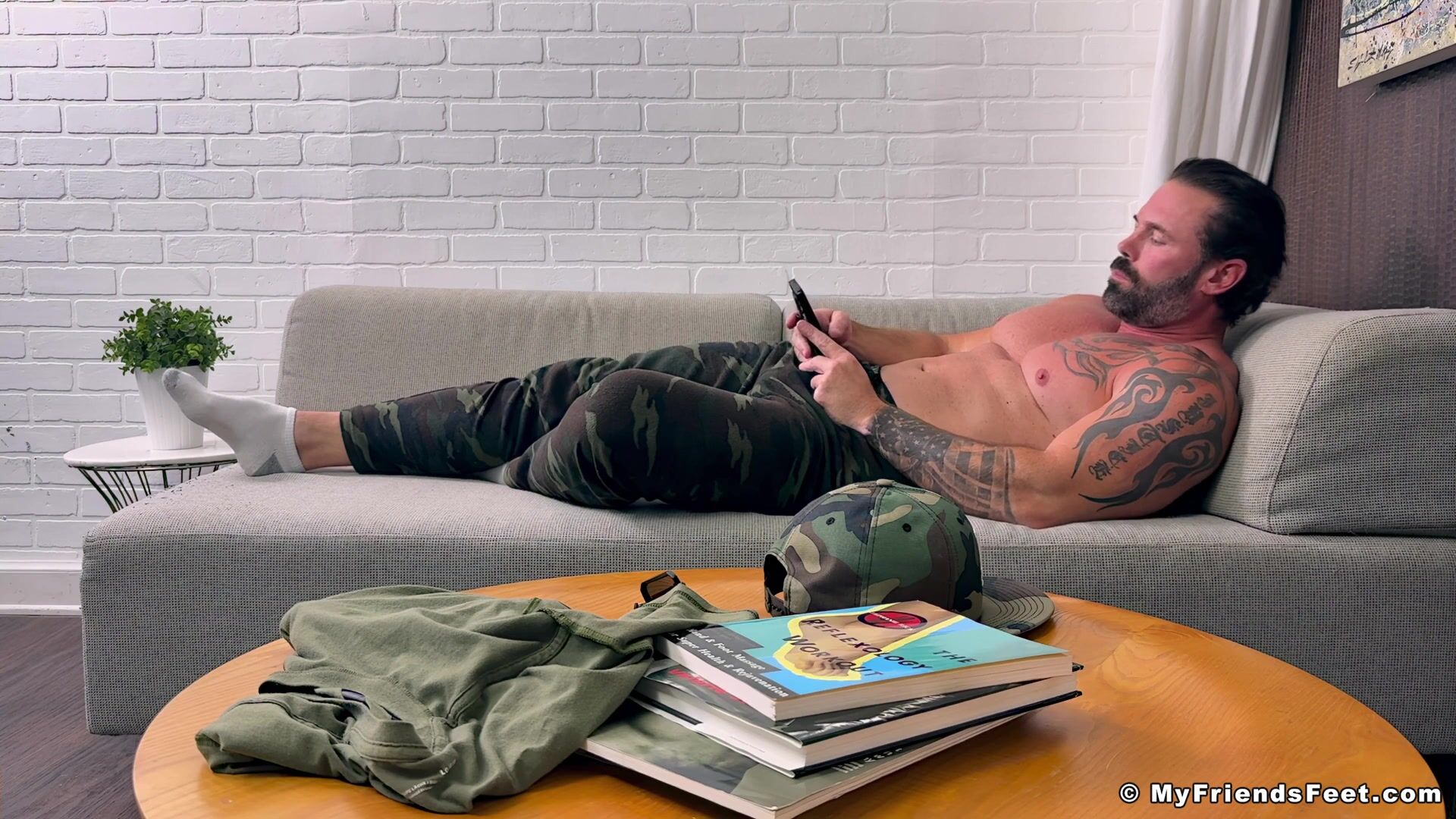 Long day for Joey and his dogs are barking! He decides to take it easy and air out his gorgeous feet and do some doom scrolling. He knows we enjoy watching him stretch and flex his feet over and over again and he gives us exactly what we are looking forward to! How about you strip a little more Joey? I am certain we would love to see it!