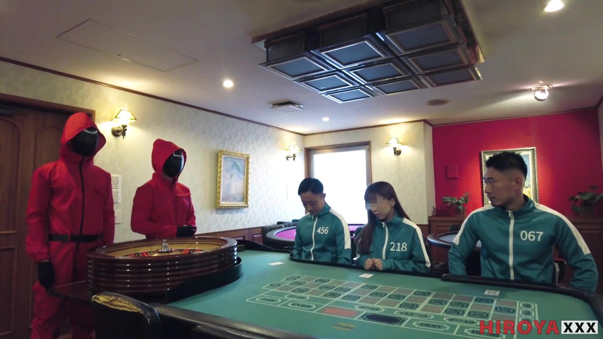 In this ambitious parody of the red-hot Korean thriller-scifi series, the masked guards and the teal-suited players are doing a good bit of raw, juicy fraternizing that we never saw in the original. Hiroya, Raech and Yuki are standouts in this erotic epic that even includes some digitally-blurred female participation in the dirty games of a sexual nature.