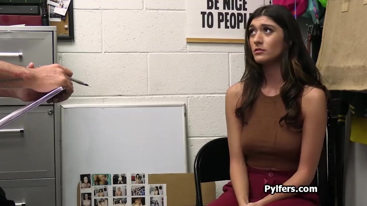 Busty flute stealing hottie gets busted and fucked in the backroom