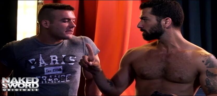 Unscrupulous club owner Adam Ramzi has granted go-go hopeful Leon Fox a private audition, but it’s not Fox’s dancing that he’s interested in. Ramzi sits at the bar leering at Fox, swilling whiskey, and groping the bulge growing in his pants. Without warning he pounces on the dancer, bends him over the stage and pours whiskey down his ass crack. He greedily licks Fox’s tight, booze-soaked hole then forces him on his knees and shoves his huge cock down his throat. Ramzi fucks Fox’s face then turns him around, shoves him up against the bar, and slams his cock in his ass. Ramzi fucks a load out of Fox and feeds it to him then shoots his own hot stream of jizz all over the stud’s back. Spent and covered in cum, Fox is certain his performance has landed him a job but Ramzi dismisses him with an evil grin, already thinking about his next conquest.
