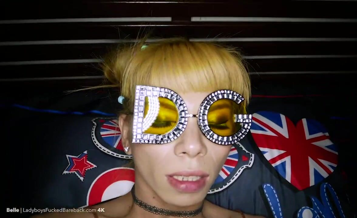 Stylish ladyboy Belle is wearing big-framed glasses and a blue sundress. She lies on the bed surrounded by toys to play with, but she first starts the POV cock and starts to suck him. Then she goes down farther and licks his balls and asshole. The POV has her bend over, oils her ass up, and fucks her doggystyle. Next, Belle pushes in a glass buttplug and then a silicone plug into her ass-pussy. After she plays with those, the POV gets up on top of her and fucks her some more. Then the POV slides a hollow toy inside her and fills her up with sperm lube. He then replaces the toy with his cock and fucks her on her back. He pushes another toy into her and goes back to fucking her again as Belle jerks herself off until she cums. The POV pulls out and sprays her asshole with sperm and then reinserts into her to work it in deep.