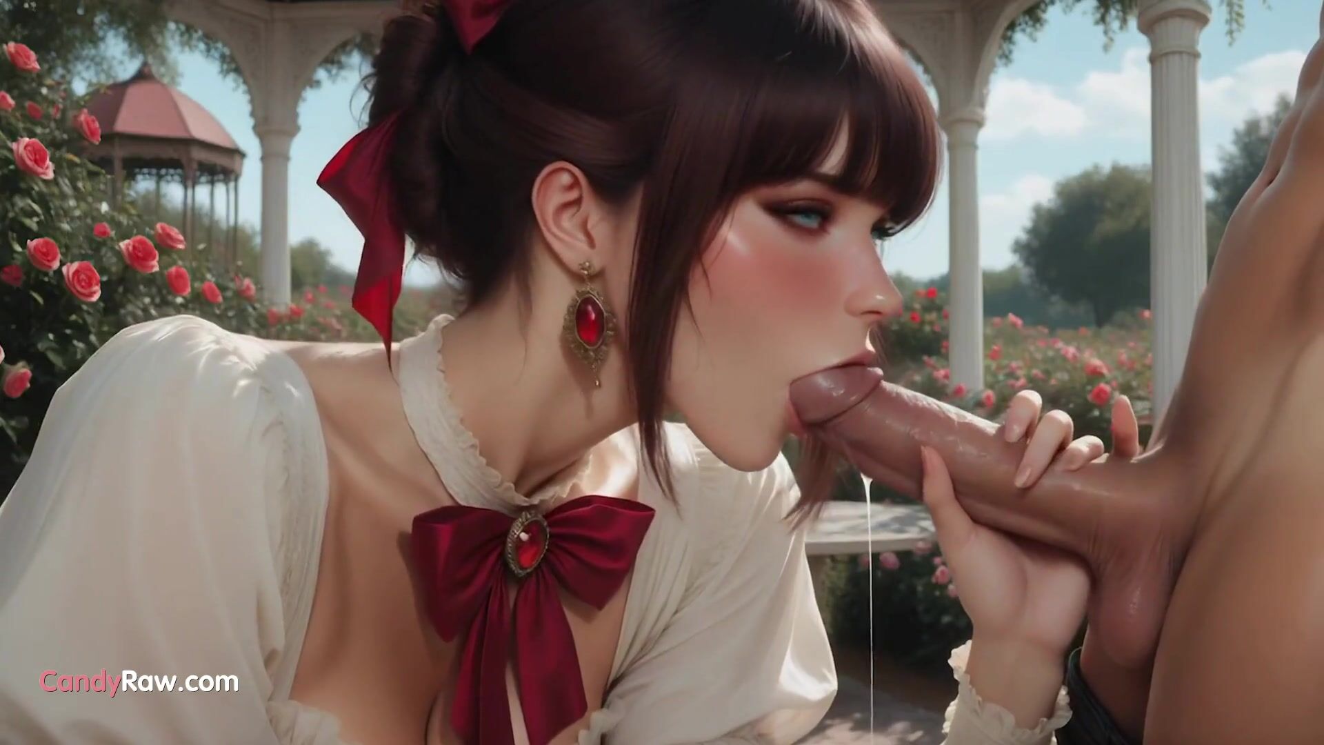 Beautiful anime-style babe with bangs and red bows flaunts massive breasts in sheer white dress surrounded by blooming roses. She deepthroats dildo and real cock, gets pussy and ass fingered, then fucked hard by man in outdoor gazebo. Features tit groping, missionary, doggy, and facial cumshots in lush rose garden setting.