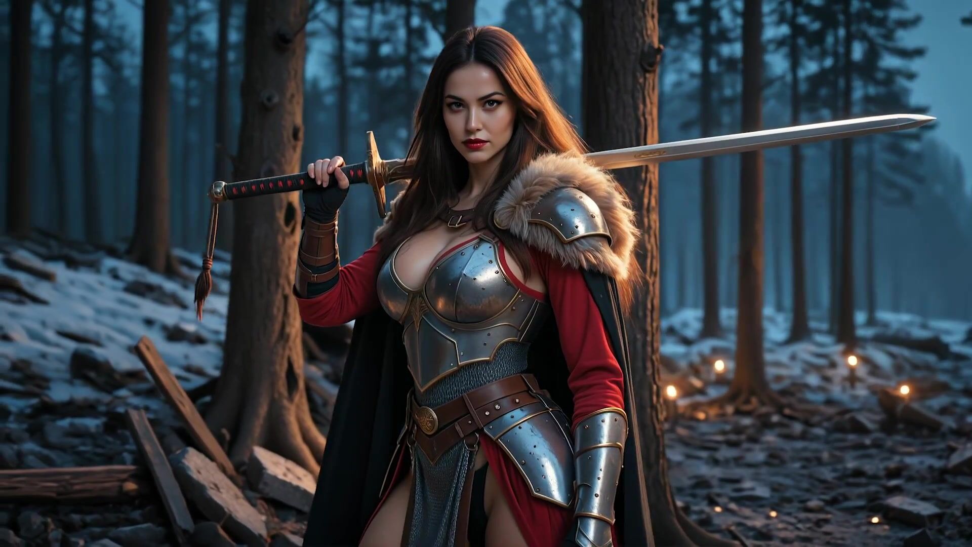 Stunning busty Viking babe in skimpy metal armor and red cape teases her wet pussy in a magical snowy forest village. She grips a thick dildo, sucks it deep, exposes massive tits, then rides cock doggystyle and reverse cowgirl on the snow. Hands grope her big ass as she moans in wild outdoor hardcore bliss.