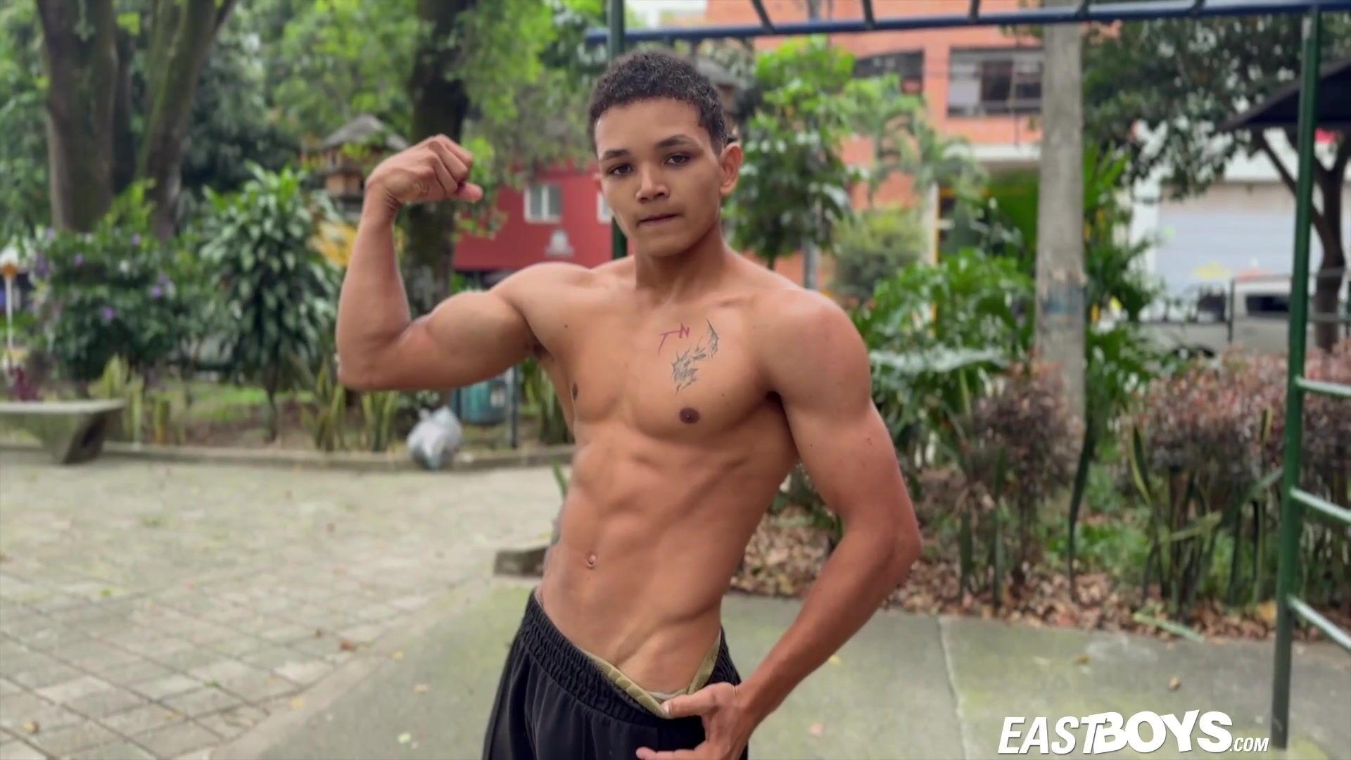 Street workout tease turns intimate: stunning teen Latino stud Teo Valdeluna with killer physique flexes his massive muscles by the pull-up bars. Inside, he strips bare, revealing inked torso. Hands worship his glistening, oiled pecs, abs & thighs in erotic massage play.