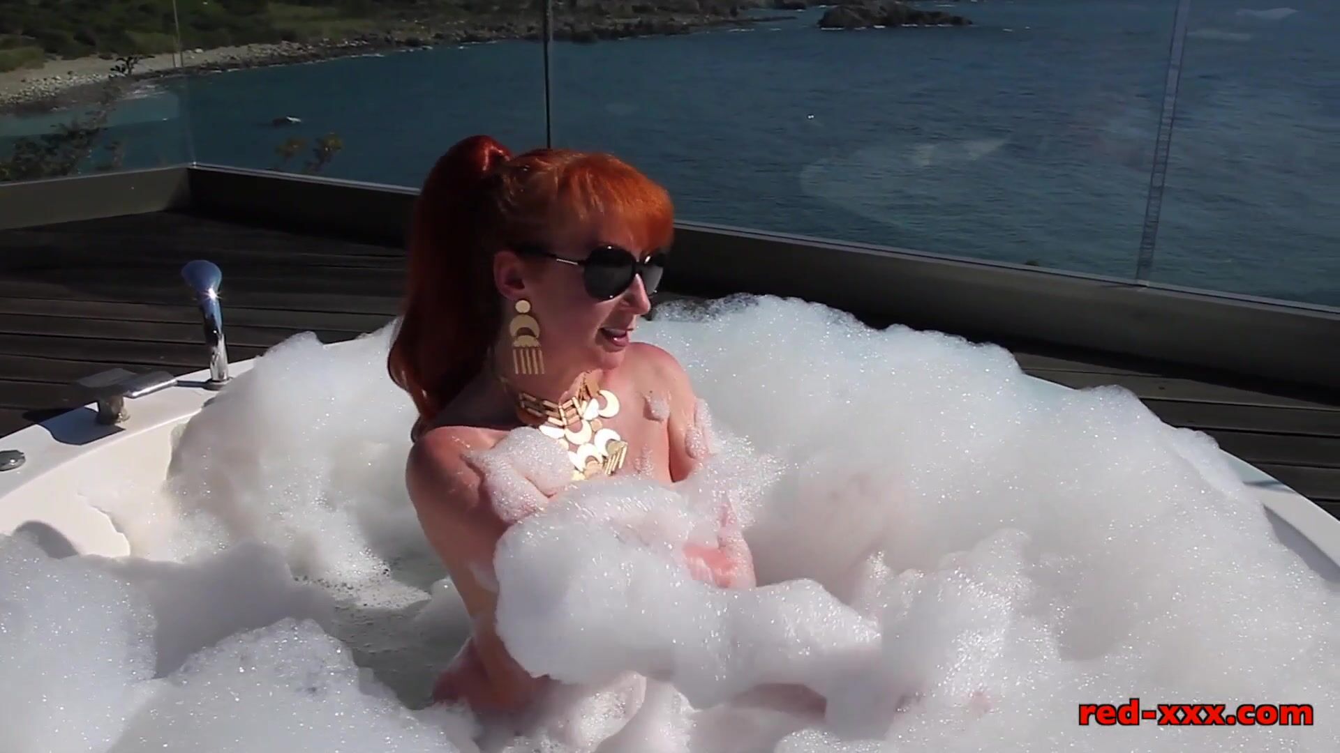 A red-haired milf on the roof bathes in a jacuzzi and fingers her pussy with her hand.