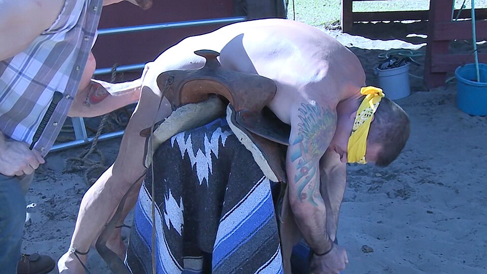 Duke (Nick Moretti) is thrown over a saddle, his bare ass slapped and flogged, his cock tugged and tormented.