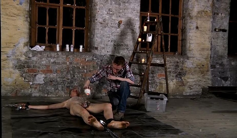 Calvin Croft cries out as dom boy Ashton Bradley covers his body in hot wax