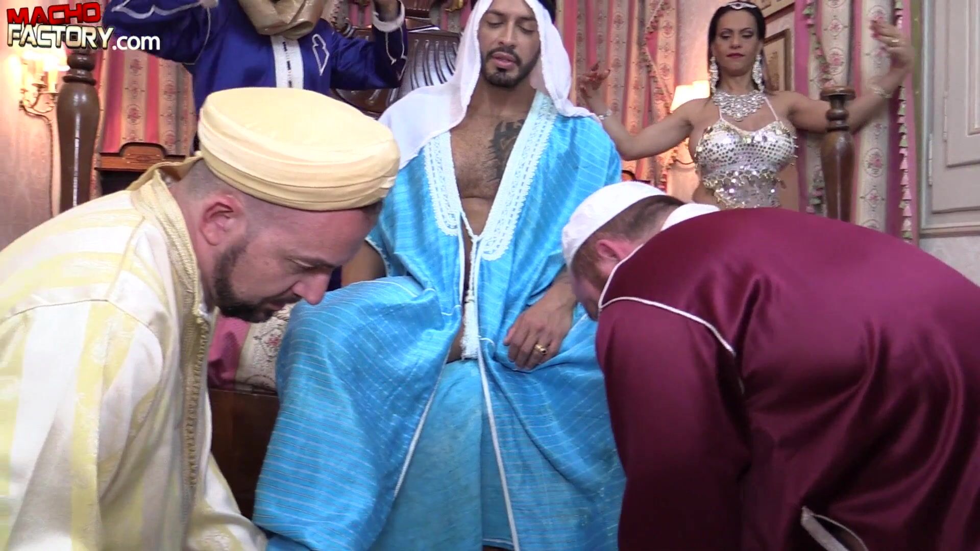 The Sultan is received in the harem and everyone ends up naked. Of course, wrapped in a kinky and horny session where cocks, bareback fucking and fisting can not be missed. The horniest oriental orgy for the heat.