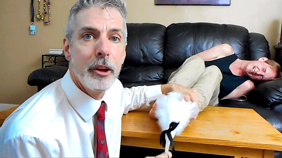 Student Jessie definitely volunteered to be the subject for tickle professor Lennox.