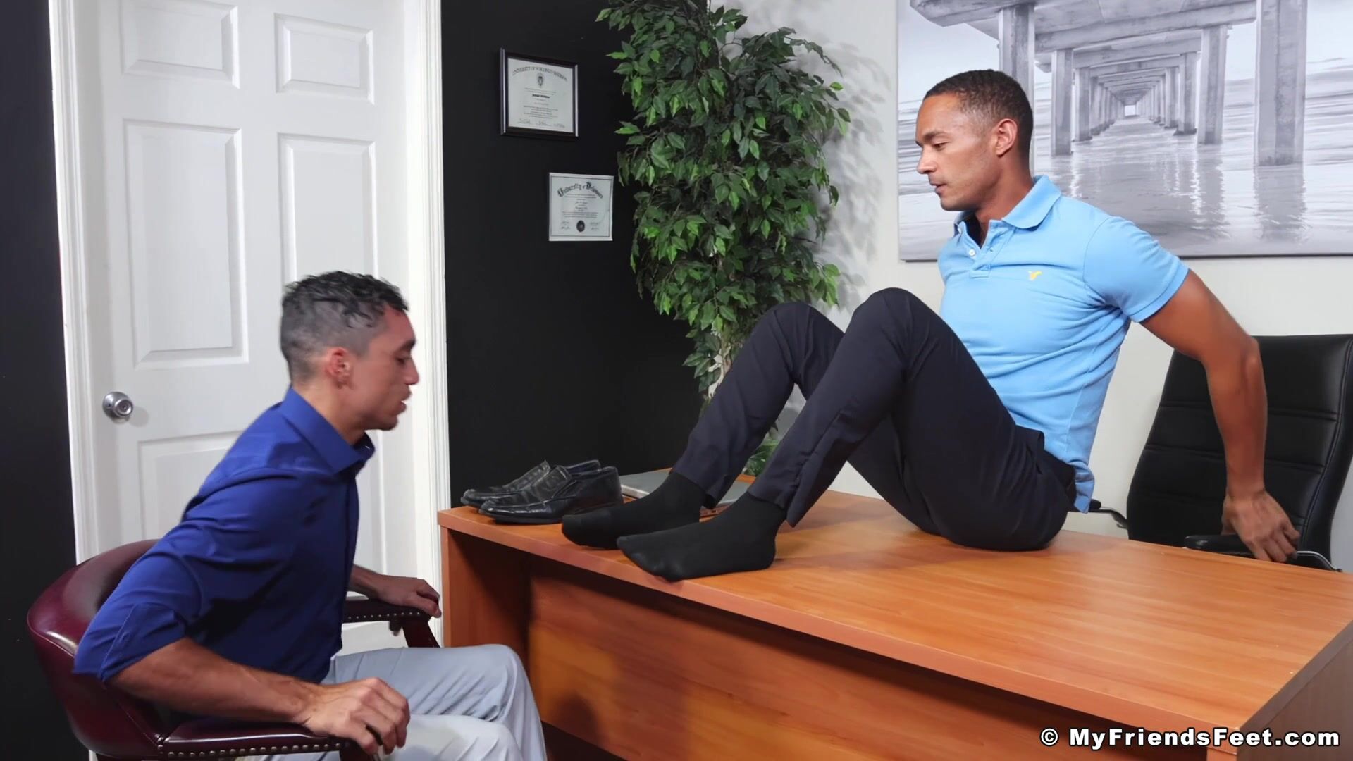 AJ lets Amone know that there is room to advance in the company IF he takes care of his boss. More specifically, his boss' feet. Amone isn't too thrilled with the idea at first, but once AJ's sock scent worms its way into Amone's brain he is instantly turned on. The boss then shows Amone what he can do with his employee's swollen member and his boss feet working in tandem. Expect long nights working together for this pair.