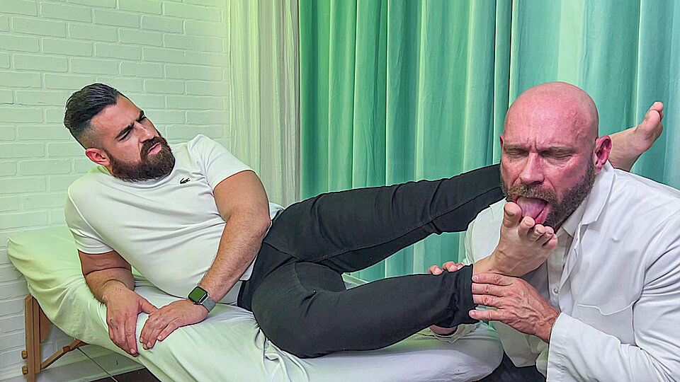Miguel comes into Dr. Killian's office because he twisted his ankle and wanted to get it checked out. As the doctor examines Miguel's foot, he realizes Miguel enjoys the rubbing and sniffing of his foot. One things leads to another and before you know it, Miguel is having both feet worshiped and Dr. Killian ends up busting a nut while fucking Miguels meaty size 11s. Like any good doctor, Killian does clean (lick) up his mess. Another satisfied patient.