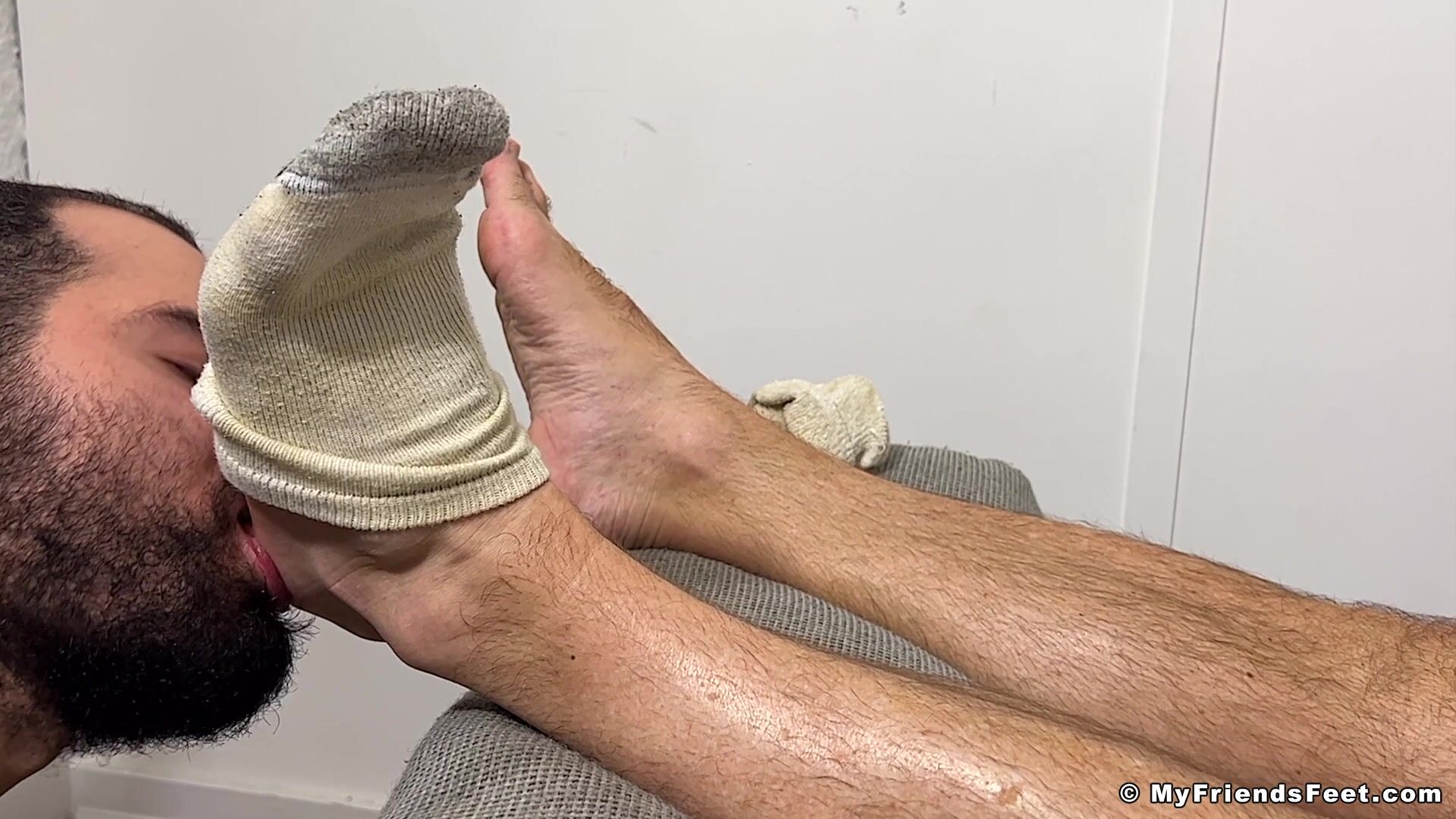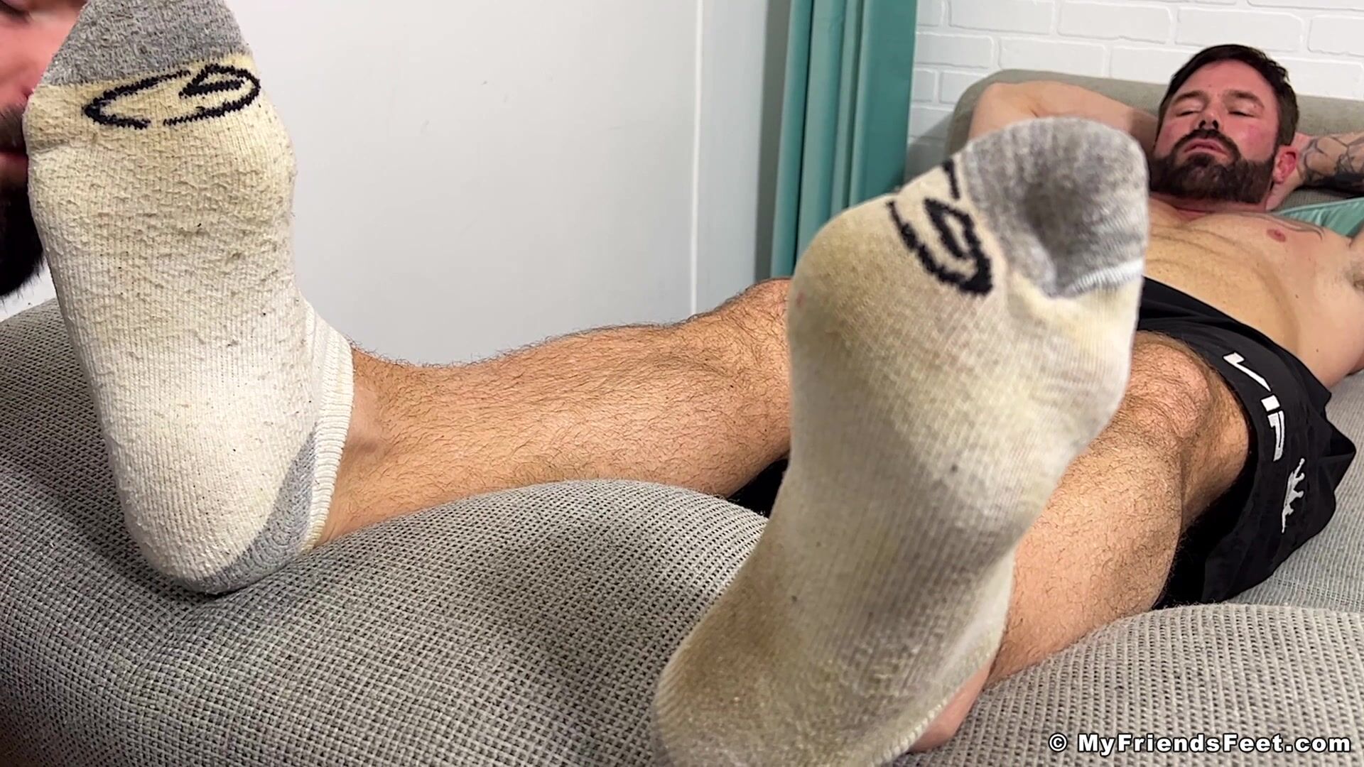 Joey is tired from leg day and he needs his socks and feet worshiped to relax him. Luckily Thom is on the case. After Thom pulls off Joey's shoes and starts sniffing his socks, Joey invites his new houseman to sniff his armpits. After big whiffs in Joey's armpits Thom headed down to Joey's toes and went to town on the muscleman's big bare feet.