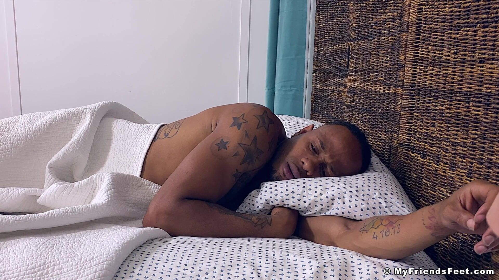 Tempo's roommate finds him in bed and uncovers his size 12 feet for a little worship. Tempo is really tired but also enjoying the attention, so he lays back down and allows the foot love to continue.