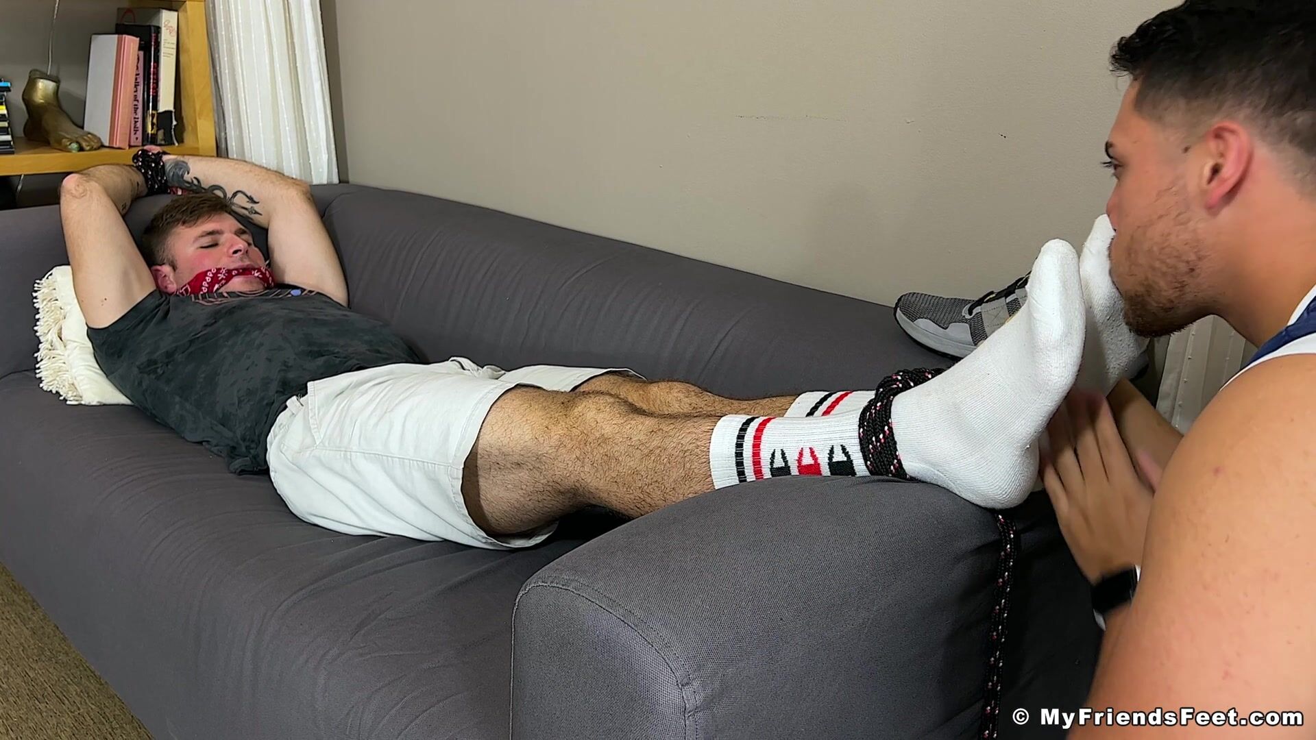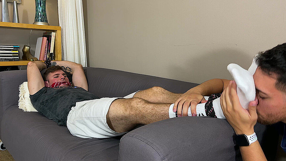 Dan made a great discovery at his gym - a new member named Nathan. Nathan has become Dan's new obsession - or rather, his feet have become his new obsession. Once Nathan was tied up in Dan's apartment he could look at Nathan's socks closely, plus even give them a sniff if he wants to. He can pull the socks off and give his captive's tasty toes a nibble or two. It's going to be a fun day for Dan!