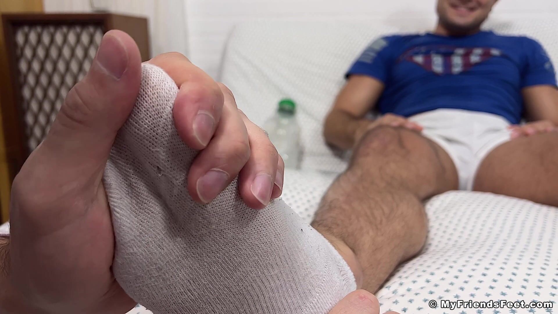 AJ just discovered that his new place comes complete with a butler with foot worship skills. That's great news for AJ's feet which are tired and sweaty from a trip to the gym.