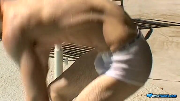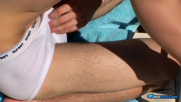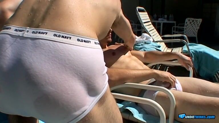 Zack jacks Mike's hard cock through his undies then shoots a big load on Mike's briefs!