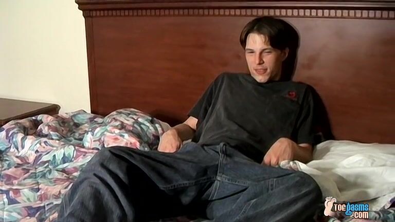 Sexy bisexual boy Aaron shows off his smooth feet and jerks his big dick