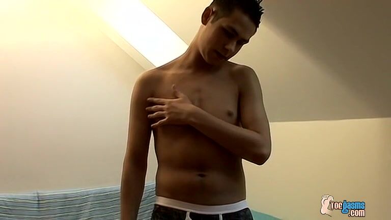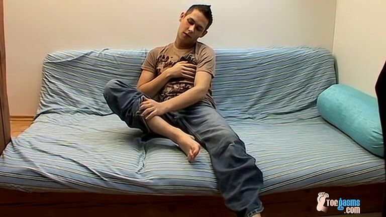 After wanking his hard uncut cock Cristian unloads his cum on his naked foot