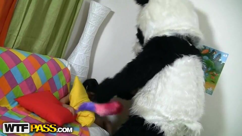 This cute teenage babe just wanted to clean her room, but suddenly a huge panda appeared. The girl got scared at first, but the panda bear was so friendly and fluffy and cute, she even forgot all about cleaning and decided to use him as a big sex toy. And why not? The panda wanted the same, 'cause his enormous dildo strap on was ready for a real sex play. As soon as the girl saw that gigantic strapon cock, she went totally wild and insatiable. Wanna know if she managed to take the whole shaft in?...