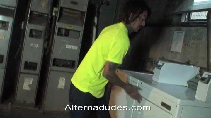 As unsexy as it is, even Thrasher has to do his laundry in the basement of his apartment building. He's minding his own business putting his formerly dirty towels in the dryer when he hears some dudes coming down the steps. Thrasher makes a split second decision to ditch the dryer and hide under the steps to spy on whomever is thumping down the stairs. nnMuch to Thrasher's good fortune, two hot rocker dudes appear and start making out. B Nefarious is tatted from head to toe and his asshole is aching for Rave's monster cock to slide inside. Thrasher is careful to stay in the shadows and they have no idea he's watching. nnAs B gets on his knees and starts choking on Rave's big uncut cock, Thrasher starts rubbing himself and whips out his own dick. It's fucking hot watching B service such a big thick dick and no one would be able to resist the urge to pound one out while watching. nnOnce B gets Rave hard as a rock, they move into a storage cage. B pulls down his pants and bends over to let Rave shove his big hard dick deep inside. B moans out. It's a big one - and it hurts. Rave has fucked enough tight asses to know that he needs to just keep pushing it in. Once Rave is balls deep, B is almost speechless. He rolls his eyes back in his head and opens his mouth but no sound will come out. Finally, he gasps, and from that point on, B can't contain the joy that he feels as Rave pumps away on the tight little ass in front of him. nnThrasher is still watching from behind the steps. The scene unfolding before his eyes is too much to take and he blast his thick creamy load all over the dirty concrete. The second Thrasher is done, a moment of clarity hits him and he realizes he could get caught. He pulls up his pants, grabs his shirt, and makes a run for it up the stairs and out without a hint of being detected. Even if he was caught, B and Rave are so wrapped up in each other that they'd never know the difference. If only Thrasher knew what he missed next, he'd be kicking himself for not sticking around. nnRave pulls his giant throbbing cock out of B's asshole and stands B up to face him. B grabs both thick dicks and rubs them together to frot to the finish. The feel of Rave's dick sliding back and forth on his own cock and balls makes B explode all over Rave's hard shaft. Spurt after spurt of milky white fluid hits its mark and B gets down on his knees to lap up his own tasty jizz. While he's down there slurping up every last drop, Rave plunges his cock in B's face and dumps his load inside B's mouth. B is in heaven as Rave finishes up. B spits a little out, letting it run out of his mouth and dangle on his chin. B stands up and gives Rave a taste of the thick mix of both their semen. It tastes good and neither of them can get enough as they make out and swap cum in the dirty basement where anyone could come and see!