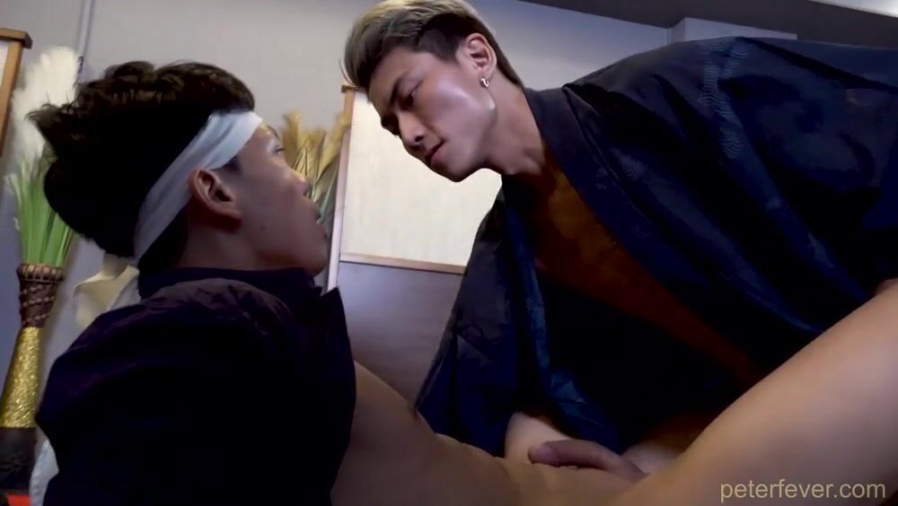 Morgen, a handsome Asian warrior with hair the color of polished gunmetal, makes a surprising entrance to the dojo and wants to join the competition to choose the new Master. He's strong, beautiful and talented in combat, but what are his motives? Yowei shows him around the school and notices Duncan watching warily. Yowei offers to spar with the stranger, and Duncan secretly encourages him to seduce Morgen and find out more. They battle fiercely to the floor, then Morgen pins Yowei down and grinds his crotch into his face. They kiss and take their erotic play further.nnMorgen pulls off his fight uniform and runs a hand along Yowei's stiffening crotch. His mouth moves from nibbling the young fighter's nipples to his hard dick. The tight muscles of Yowei's abs ripple as his body responds to every nip and caress. Morgen lefts his big tool flop out of his loincloth as he moves behind Yowei and presses into his ass crack. Not betraying any emotion, Morgen deftly enters the young stud and pumps his prick in deep and hard. Yowei turns to wrestle his tongue with Morgen's in a manly tangle of bodies. He turns onto his back and wraps his legs around Morgen, then climbs on top for a grinding ride. Morgen plows straight up into his opponent, holding his hips as he guides his cock in to the root. In the corner we see Duncan watching and reaching down to stroke his dick in arousal. He steps over to the pair and joins in, holding Yowei's ankle to pin his legs further apart. Morgen moves aside to give Duncan his chance at the tight smooth hole. Yowei's jaw drops open to take in Morgen's cock as he's getting his butt rammed. Pinned between the two powerful tops, Yowei gets his chest and belly drenched with manly cum.