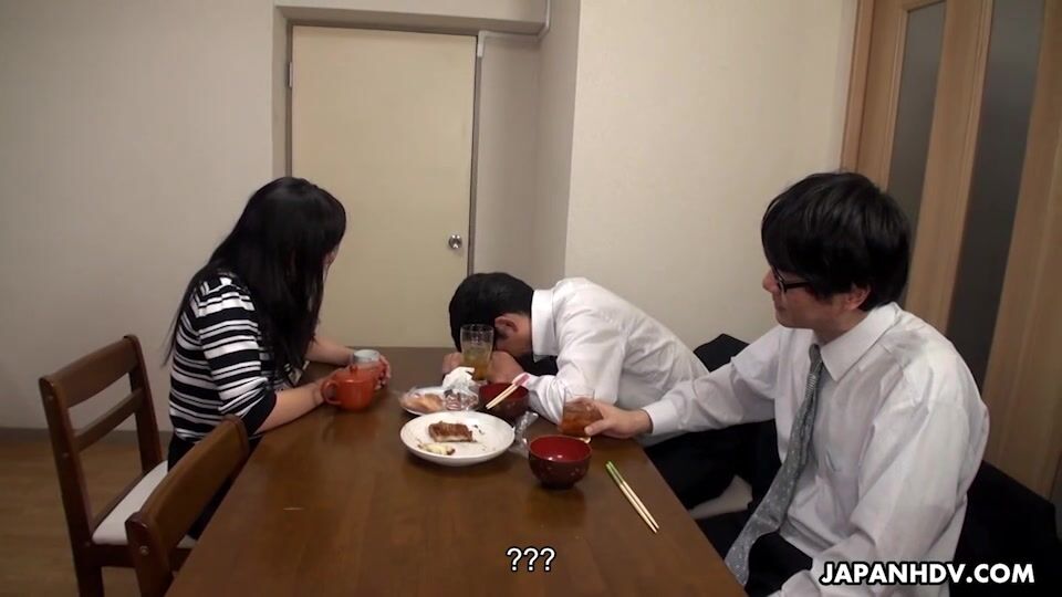 Risa Kurokawa has wet hairy cunt strongly fingered next to her drunk hubby. She rides this young man's cock and sucks it right over her husband's head. After she's screwed just as she loves it, this slut gets cum in pussy, right next to her husband.