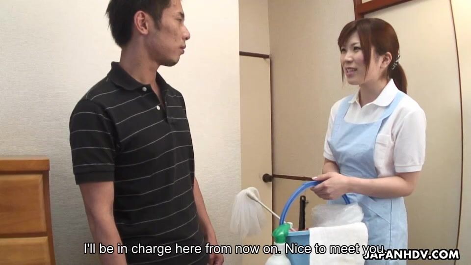 Nana Oshikiri is a such a naughty house maid. She gets horny easily as you can see in this video. She seduced her young and well hung customer. His cock penetrated deep in that adorable trimmed pussy and this babe just loves a creampie award.