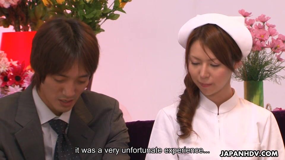 Cute medical nurse Rino Asuka gets blindfolded and all covered in oil as she gets her uniform off and enjoys in getting her hairy slit stimulated by vibrating sex toys and making her really turned on and ready to ride her former patients dick on set.
