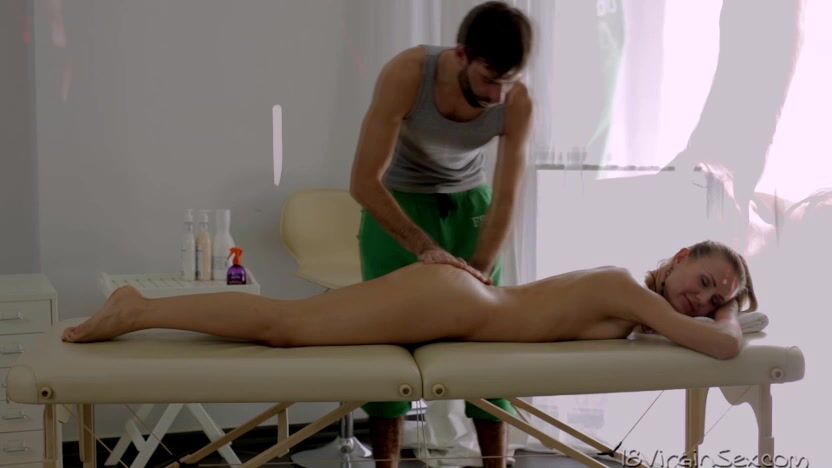 Julie lifts one leg to let masseuse get a better view of her pussy