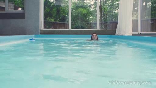 Sexy chick kneels in front of a half-naked old man to give him a deep blowjob and to caress him with her beautiful tits at the pool. Sure, she does not forget to rub his balls with her soft hands.