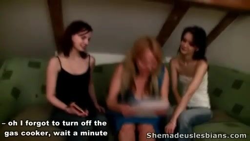 Horny girls Rosy and Tina are naked on the sofa. Their teacher tells them what to do and pets her wet slit.