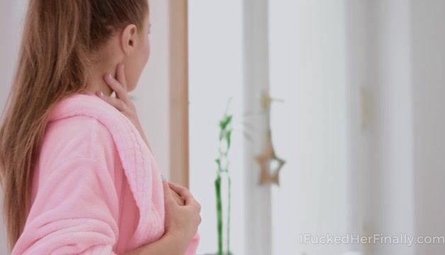 Kneeled cutie manages to take her lad's dick into her throat from head to balls