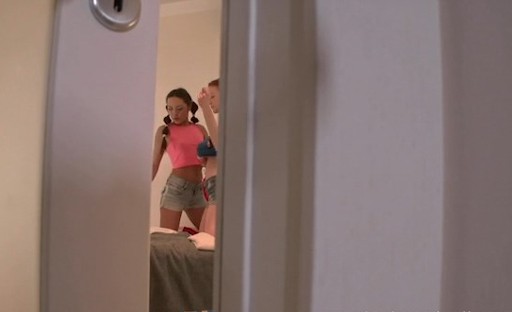 Excited stud spies on cuties to shoot them stripteasing but soon enjoys their tight holes