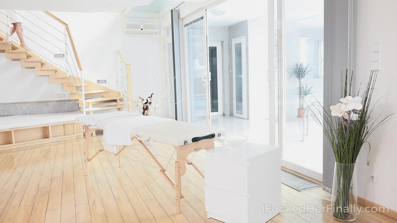 Cutie lies down on massage table to get her tired muscles relaxed and pussy fucked deep