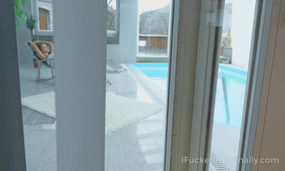 Kinky cameraman catches a naked babe having fun with her juicy pussy by the indoor pool