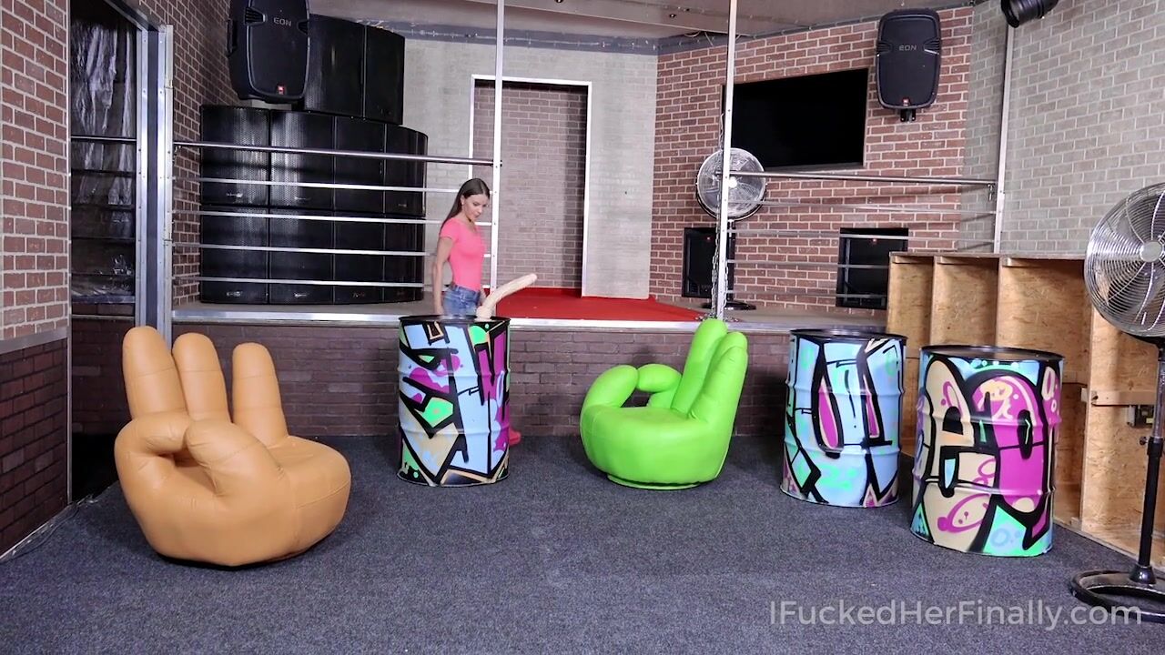 Petite brunette takes a giant dildo into her hands