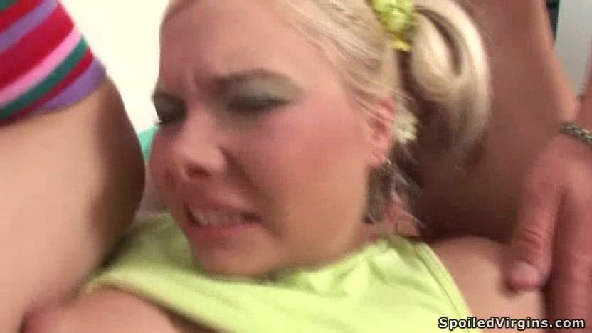 Sex-hungry virgin blonde decides to get rid of her hymen and takes two cocks up her shaved pussy on camera