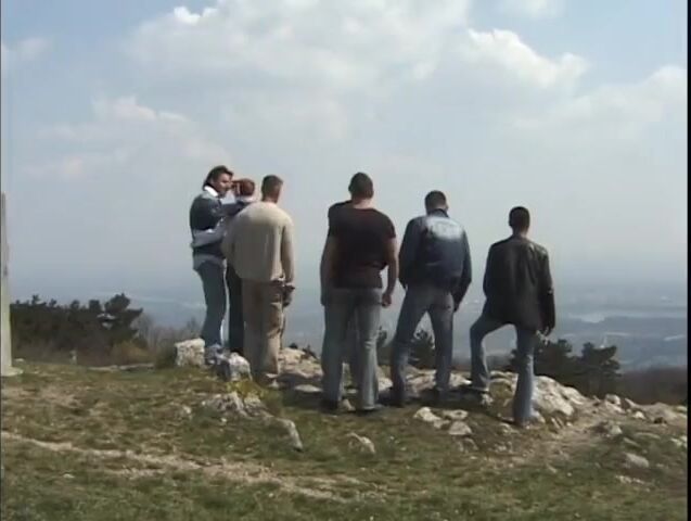 Redhead pounded by many guys outside on top of a hill until they all cum all over her ass.